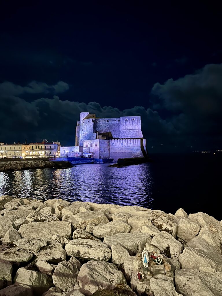večerní zátiší s vaječným hradem (Castel dell’Ovo), zátokou s trochou odpadků a nezbytnou svatou Panenkou