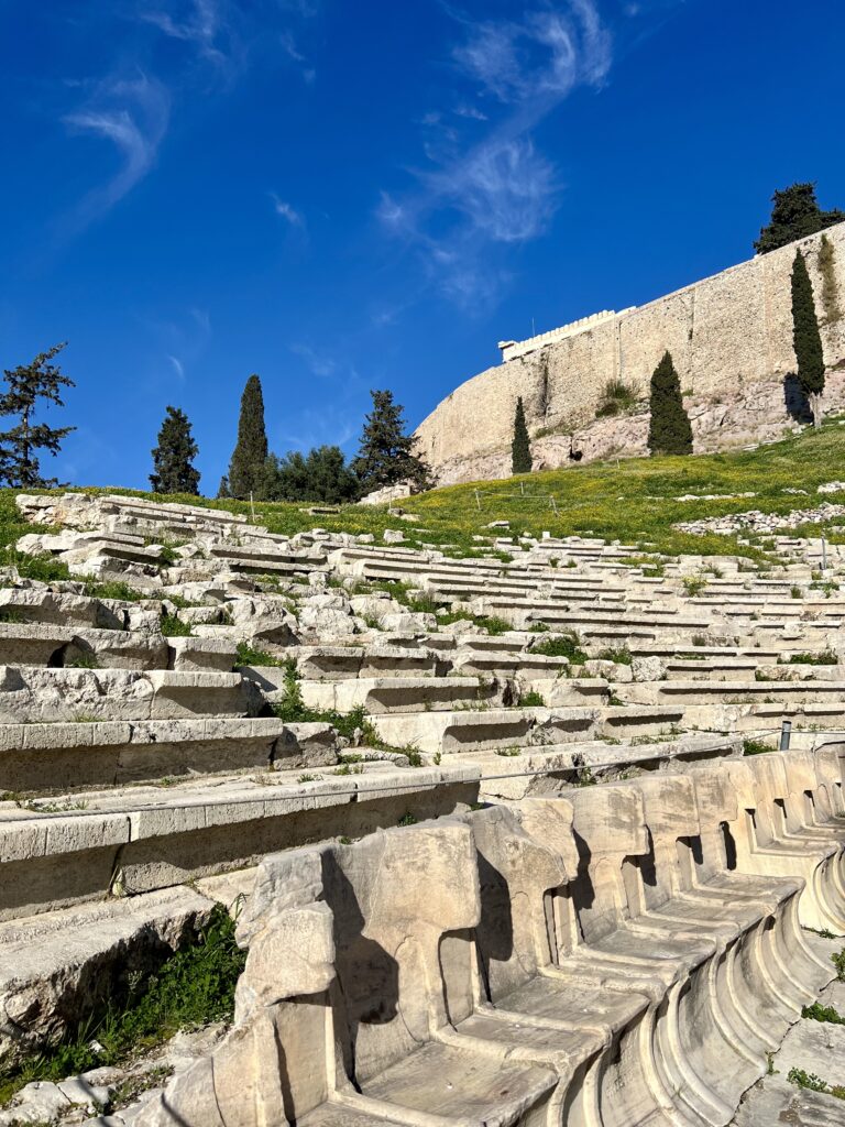 Na jižním svahu se nachází Dionýsovo divadlo, místo, kde se zrodilo antické drama. Je považováno za nejstarší známé kamenné divadlo na světě a pojmulo až 17 000 diváků. Byly zde uvedeny hry Sofokla, Euripida, Aischyla nebo Aristofana. Dnes z něj mnoho nezbylo. Na stejném svahu stojí i římské divadlo Odeon Heroda Attika z 2. století n. l., které prošlo částečnou rekonstrukcí v 50. letech minulého století a od té doby je aktivně využíváno ke koncertům a představením. Jeho kapacita je 5 000 diváků a určitě stojí za to se u něj zastavit.