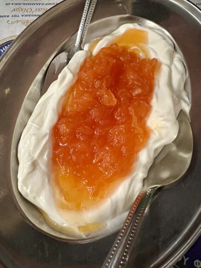 Lehce šokující byla informace, že výborná zavařenina na dezertním jogurtu, který jsme jen tak mimochodem dostali od zdejší šéfky jako pozornost, je připravena z mrkve. To bychom neuhodli. Od našeho návratu se snažíme koupit jogurt, který by byl tak lahodný, jak si odtud pamatujeme. Už jsme koupili celou řadu nejrůznějších výrobků a mnohé z nich byly skvělé, ale tomu, který jsme ochutnali ten večer, se žádný nevyrovná. Καλή όρεξη!