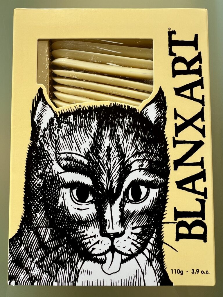 Musela jsem zakoupit i španělskou verzi kočičích jazýčků, jedné z nejmilejších cukrovinek mého dětství. Možná si vzpomenete na hnědý balíček se dvěma bílými načechranými koťaty z čokoládovny Sfinx. Dnes už ty na českém trhu povětšinou nejsou dobré, vozím si proto z Rakouska Katzenzungen od firmy Küfferle. Blanxart je rodinná firma z Barcelony a jejich jazýčky jsou perfektní kombinací čokoládek nostalgického tvaru v balení s moderním designem, které jsem si zamilovala na první pohled.